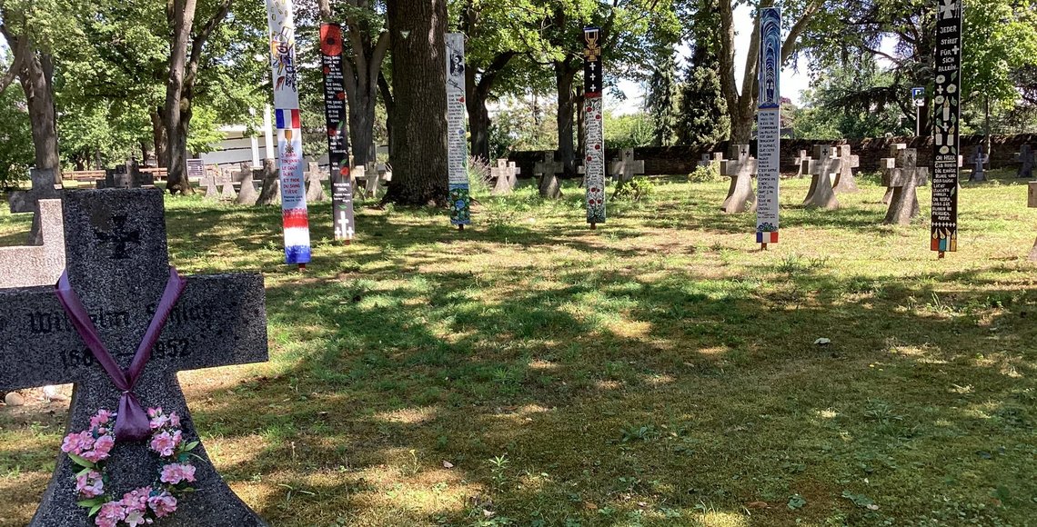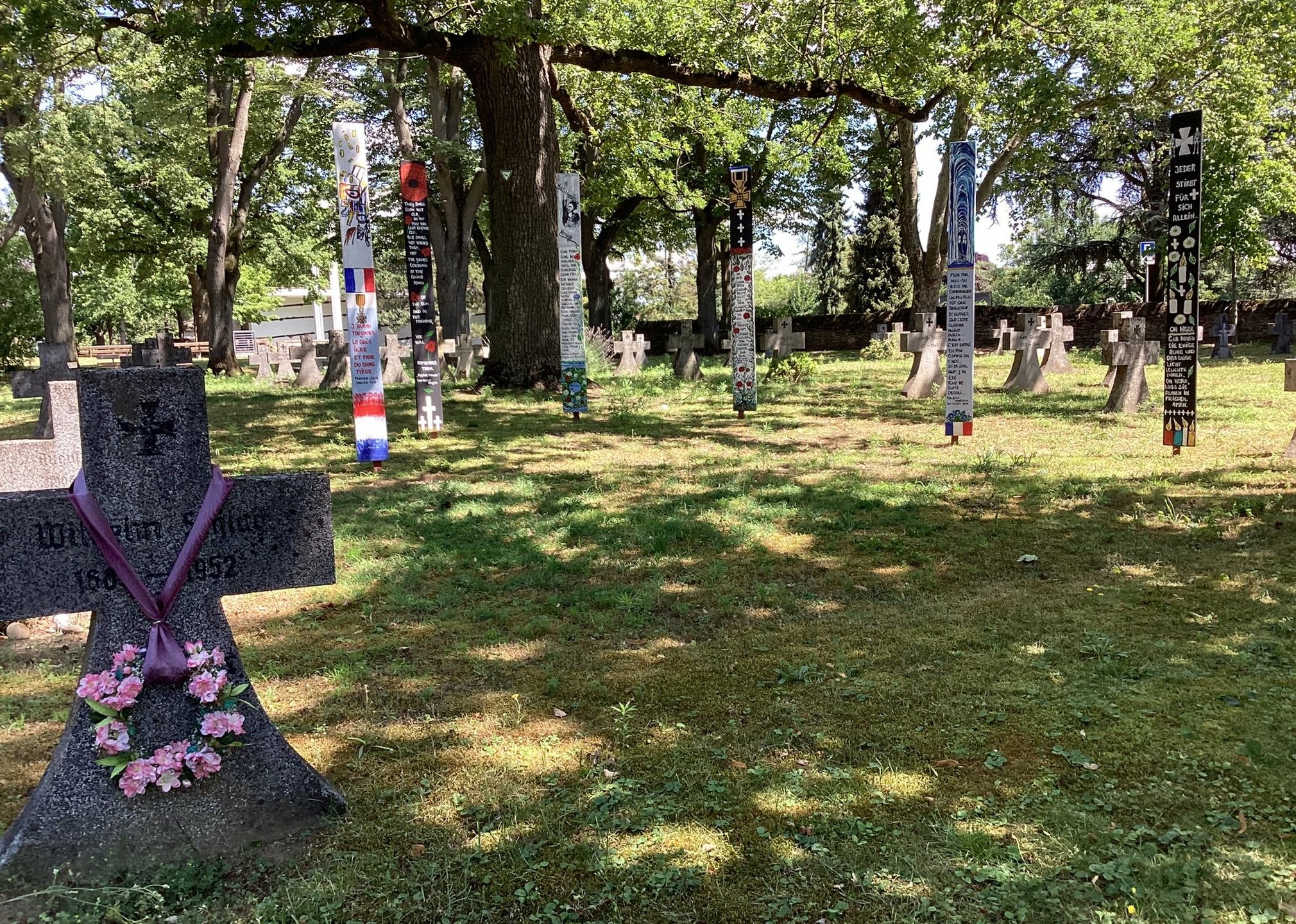 Bis zum 4. August ist die Wanderausstellung „Nie wieder Krieg“ von Bali Tollak bei den Kriegsgräbern („Ehrengräbern“) auf dem Friedhof in Walldorf zu sehen.